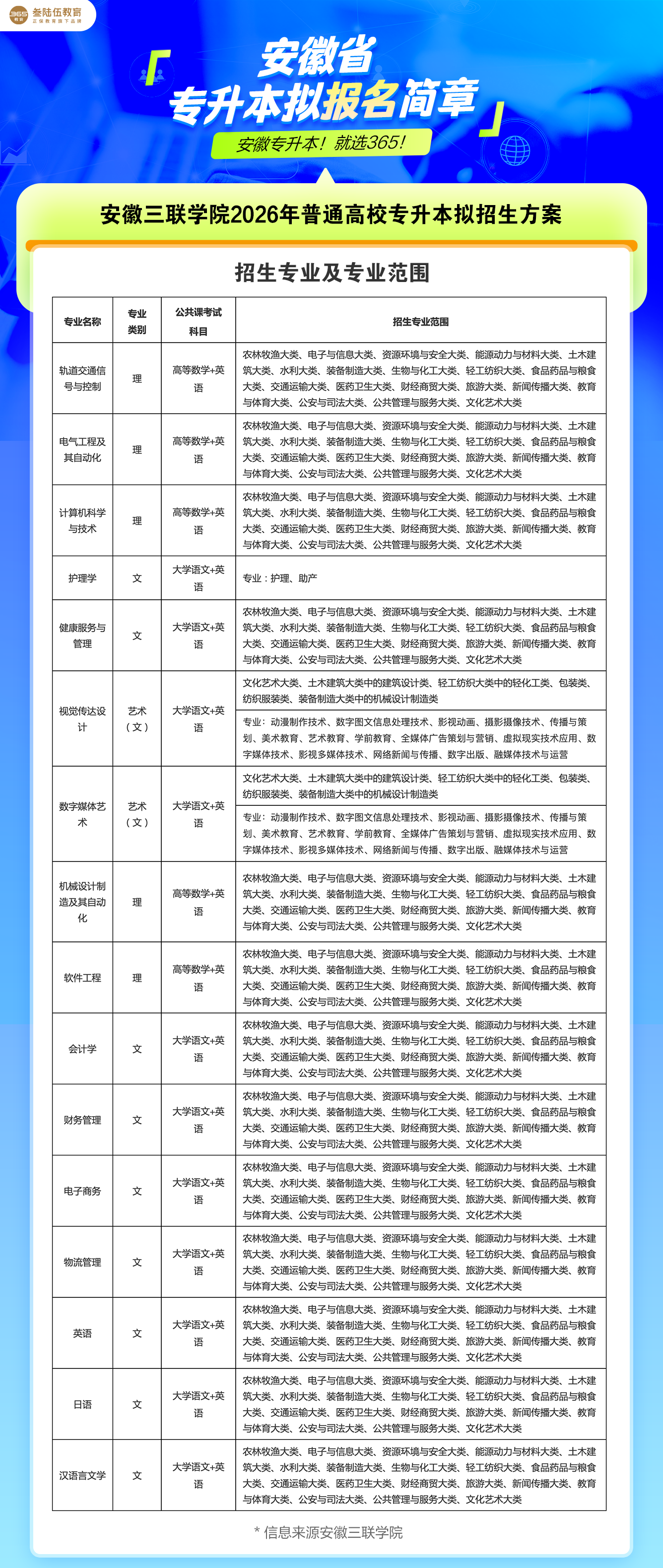 安徽三聯(lián)學(xué)院2026年普通高校專升本招生方案(擬)