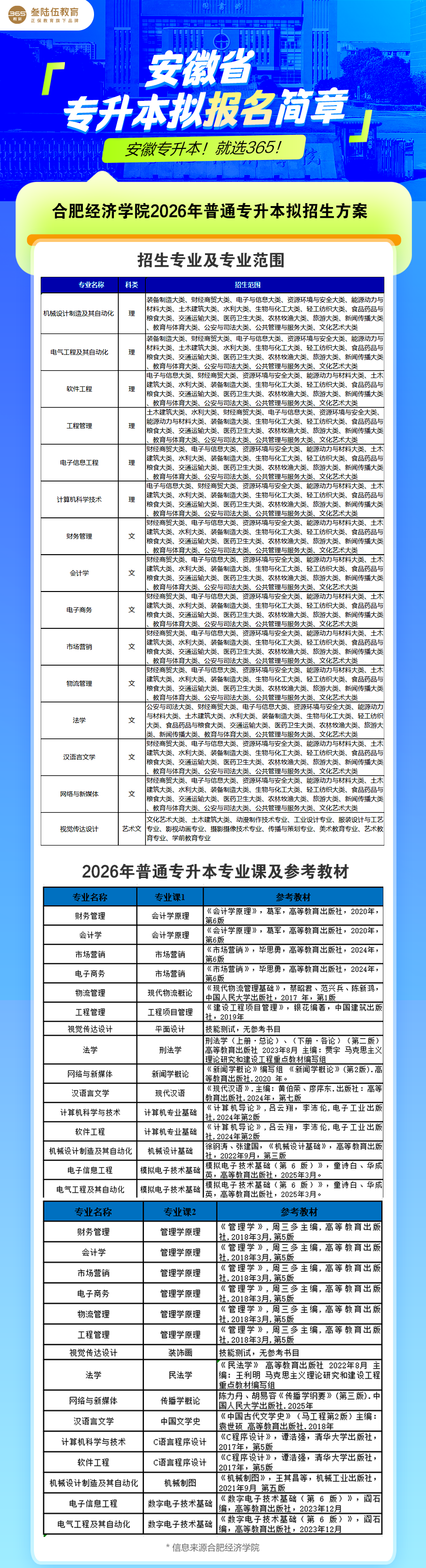 合肥經濟學院2026年普通高校專升本招生方案(擬)